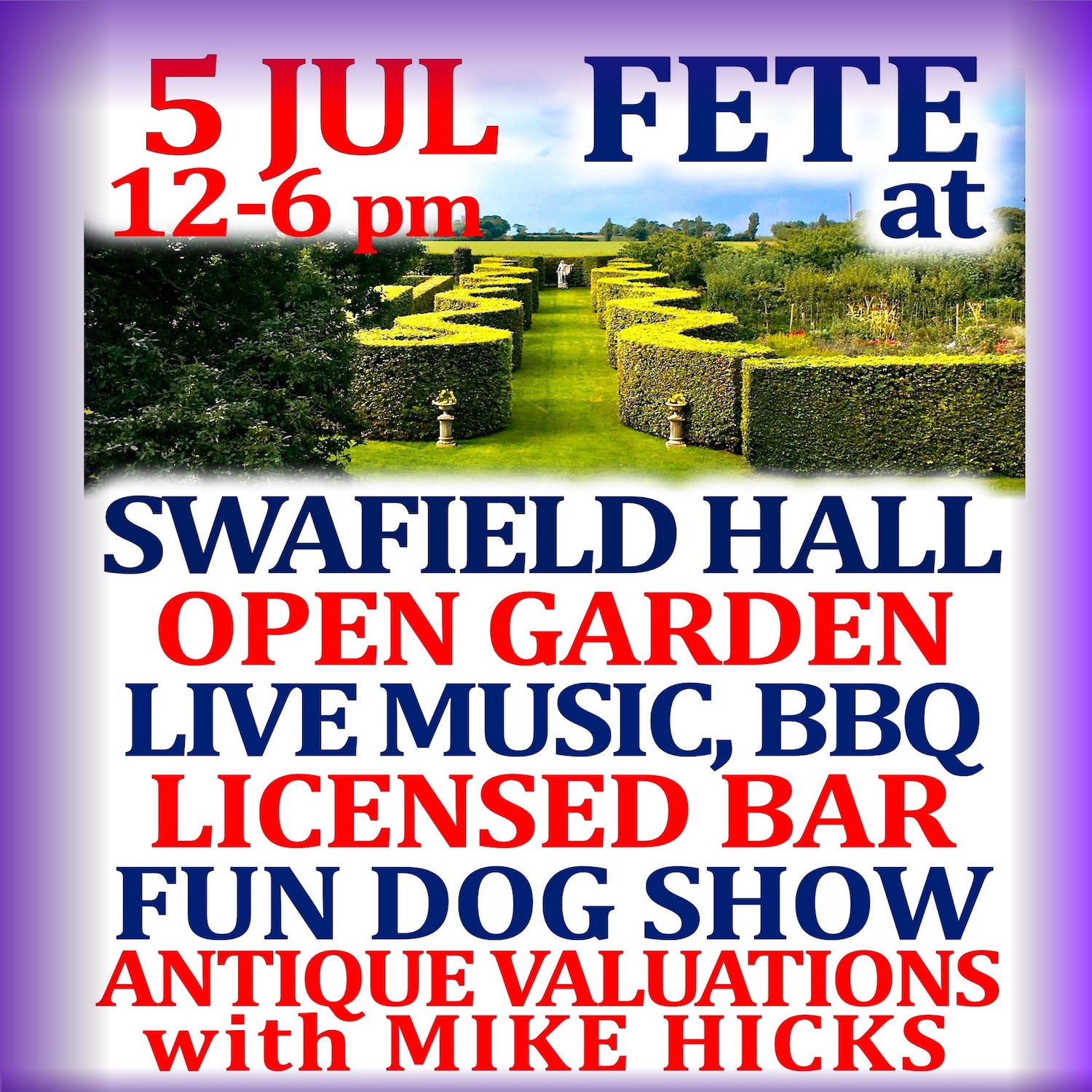 Swafield Hall FETE a very, very big and full of fun garden party, with OPEN GARDENS, Licensed bar, LIVE MUSIC, BBQ, The Fun Dog Show, teas, coffee and cakes, Raffle (with big wonderful prizes).